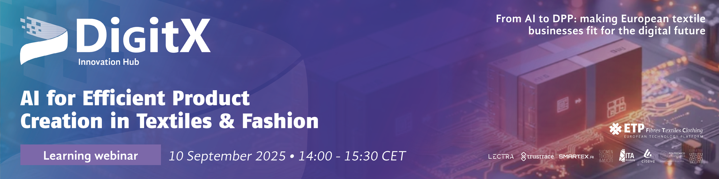 In partnership with Lectra (FR), TrusTrace (SE), SmartexAI (PT), ITA Academy (DE), CITEVE (PT), Finnish Textile & Fashion (FI), Politecnico di Milano - Dipartimento di Design (IT) and EURATEX, Textile ETP launched the DigitX Innovation Hub to serve as a central hub for textile companies, research organisations, brands, and retailers to converge, learn, network, and collaborate on the key topics related to the digitalisation of the textile sector.