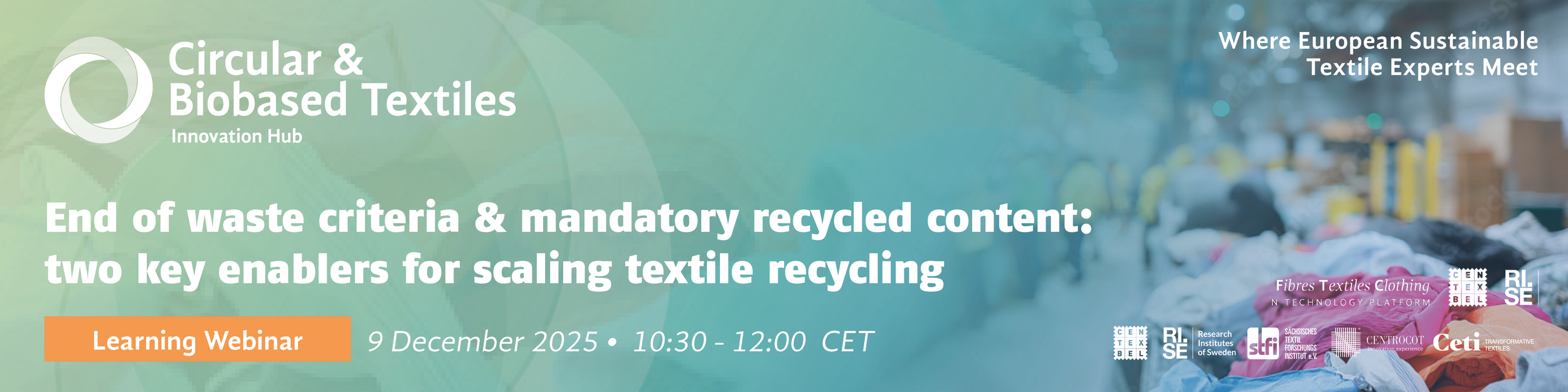 Together with STFI (DE), RISE (SE), Centexbel (BE), Centrocot (IT), and CETI (FR), the Textile ETP launched the Circular & Biobased Textiles Innovation Hub to help textile companies, research organisations, brands and retailers to learn, network and collaborate on the hot topics of circular and biobased textiles.