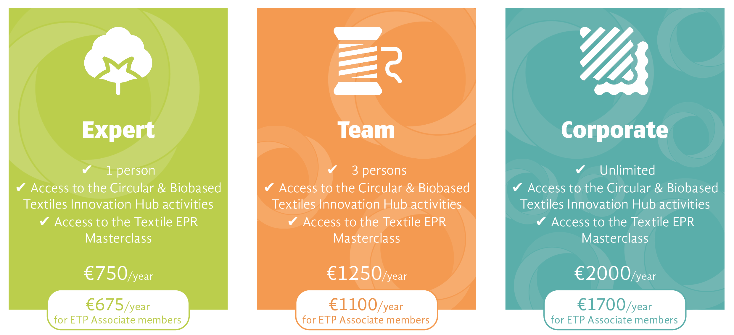 The Textile EPR Masterclass is a six-month programme with a one-time, non-recurring payment. You can join with the masterclass membership only, or choose the Circular & Biobased Textiles Innovation Hub membership, which already includes full access to the Masterclass programme.