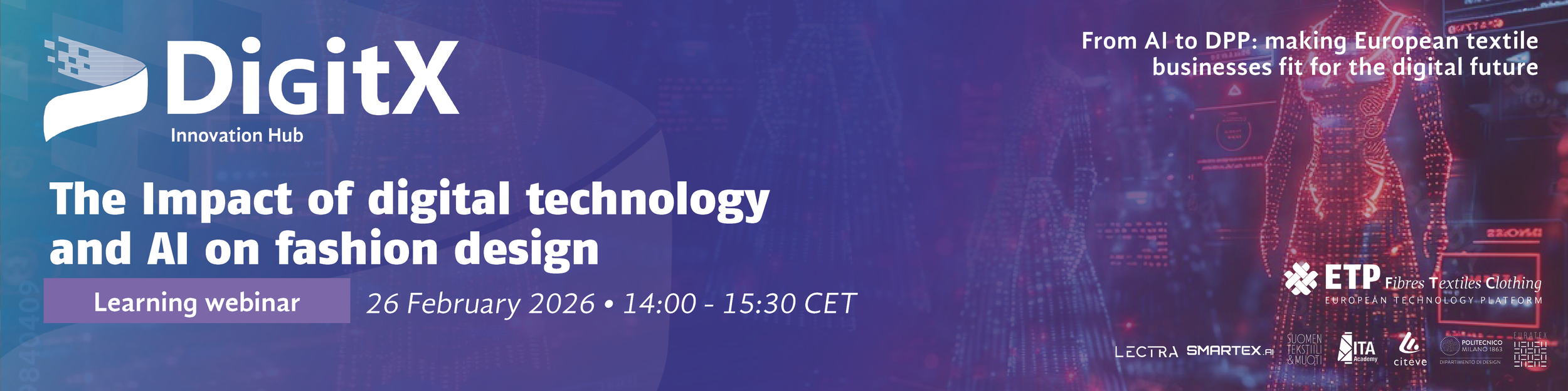 In partnership with Lectra (FR), SmartexAI (PT), ITA Academy (DE), CITEVE (PT), Finnish Textile & Fashion (FI), Politecnico di Milano - Dipartimento di Design (IT) and EURATEX, Textile ETP launched the DigitX Innovation Hub to serve as a central hub for textile companies, research organisations, brands, and retailers to converge, learn, network, and collaborate on the key topics related to the digitalisation of the textile sector.