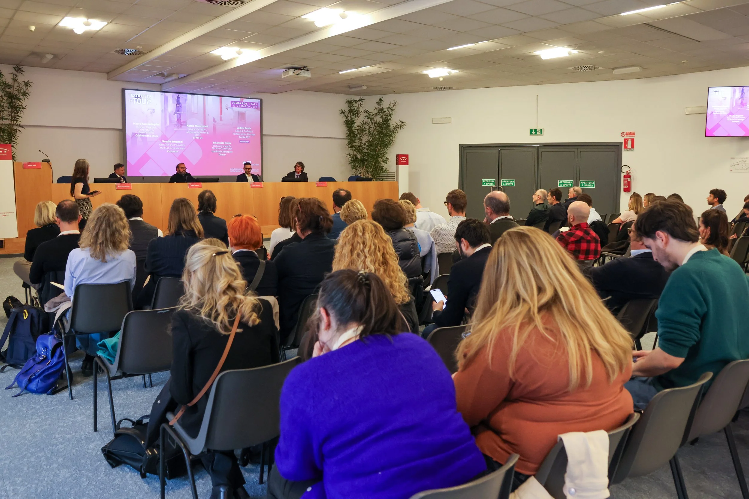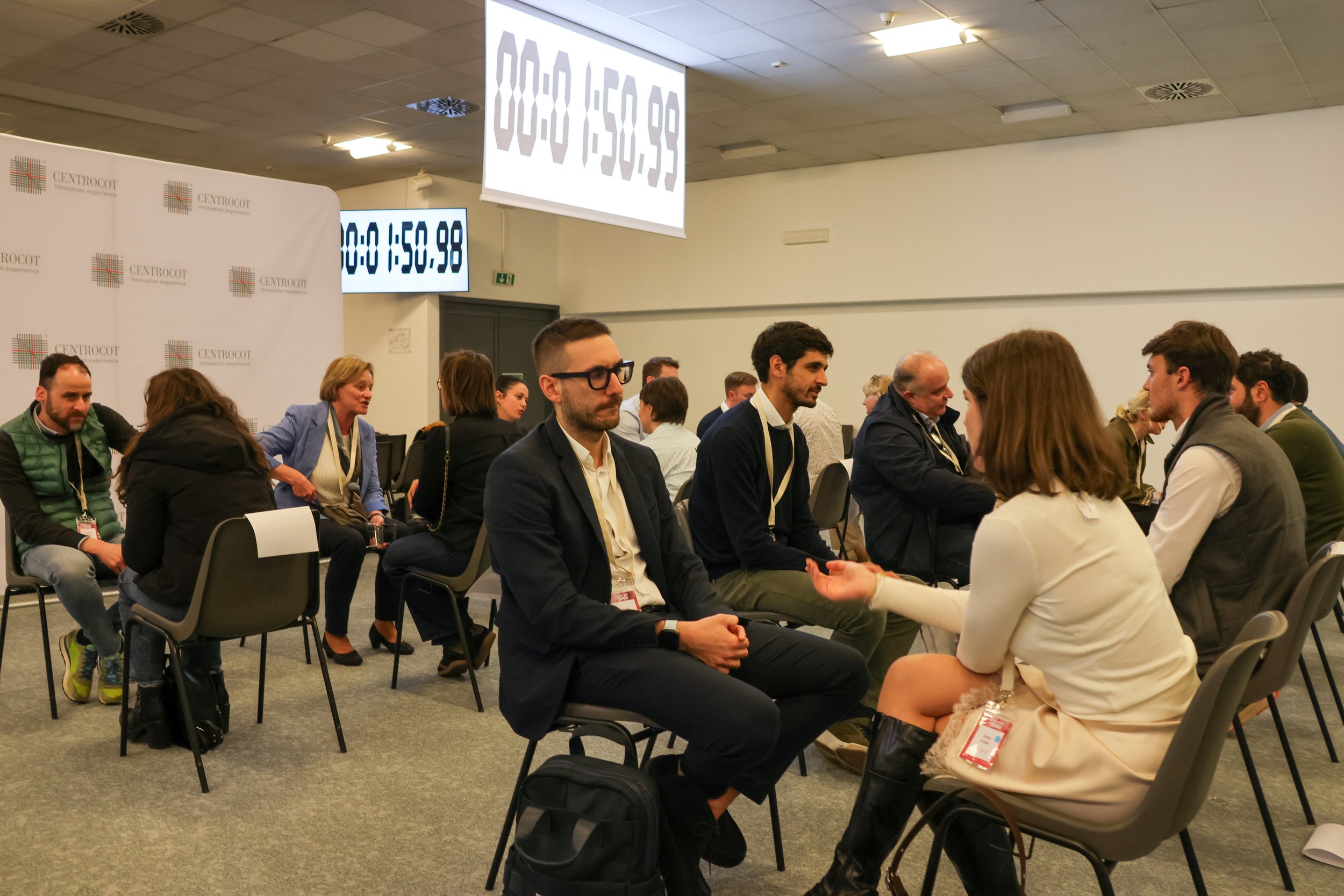 The afternoon brought a panel discussion on defence and protection technologies, featuring Mauro Sampellegrini (Confindustria Moda), Claudio Brugnoni (Centrocot), Mattia Muracchioli (STAM Srl), and Emanuele Merlo (Lombardy Aerospace Cluster), moderated by Judith Bosch (Textile ETP). The session sparked lively exchanges with the audience on the role of advanced textiles in safety and defence applications. The day concluded with a speed dating session, giving participants the opportunity to connect one-on-one and explore potential collaborations across Europe.