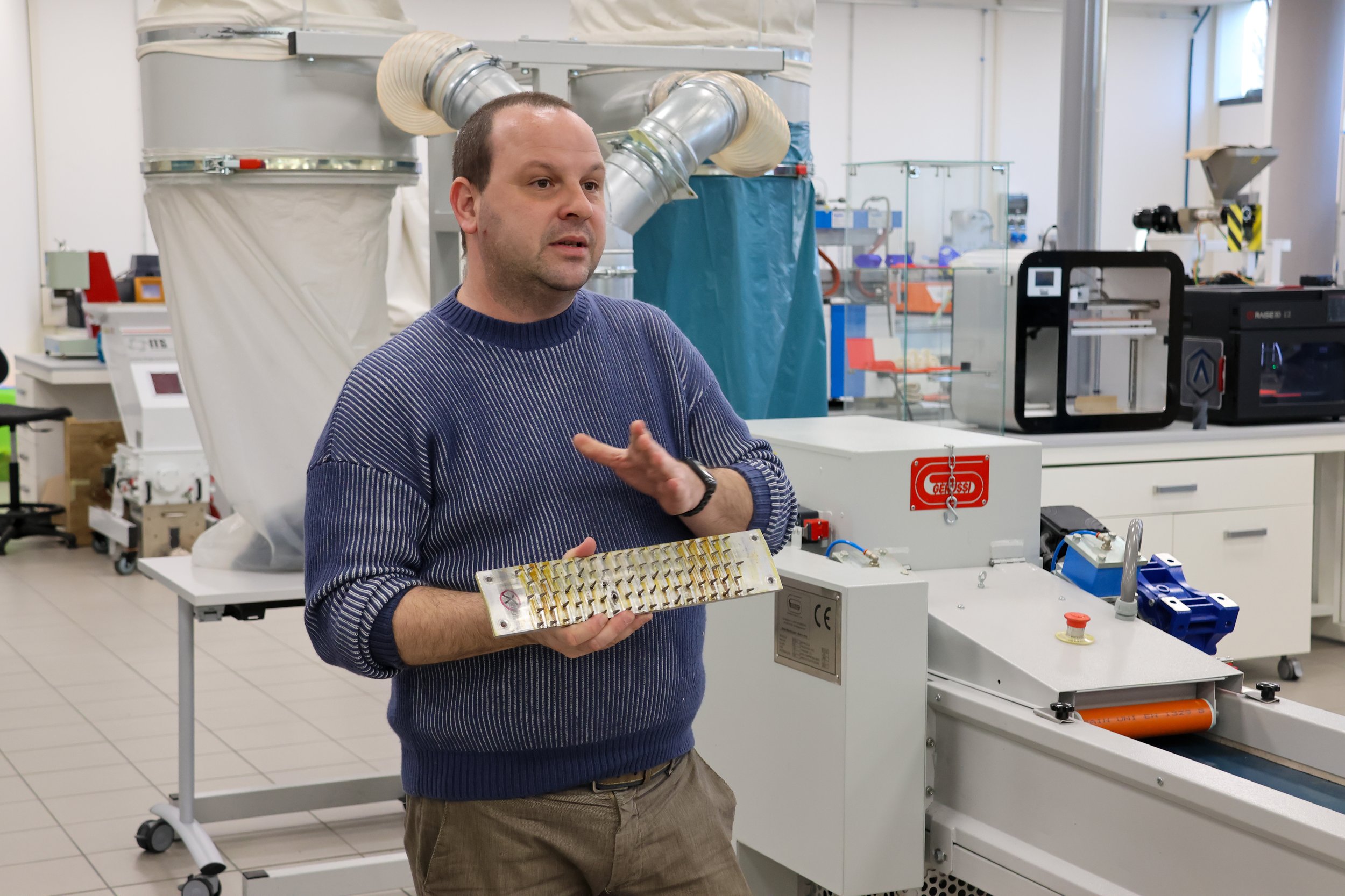 Members were treated to a full tour of Centrocot's laboratories, covering the full breadth of the centre's capabilities: fibre composition analysis, chemical and dyeing labs, finishing process testing (including oil and water repellency), PPE certification and garment breakability testing, footwear testing, and fire and heat resistance testing. The visit continued at the Centrocot MultiLab, where a series of innovations developed through collaborative research projects were showcased, illustrating the centre's commitment to applied textile science.